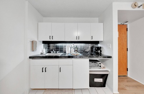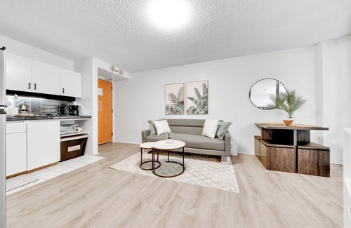 Enjoy our newly renovated Mountain View Suite complete with views of the mountain range and downtown Honolulu. This suite is 465 sq ft and features a complete kitchen and separate living area. Sleeps up to 3 guests on 1 Queen bed and 1 Full-sized sofa bed. Conveniences include high-speed wifi access, air-conditioning, a 55" flat-screen TV, a desk, complimentary bathroom toiletries, an iron & ironing board, a hair dryer, cleaning supplies, and beach towels. The kitchen is supplied with everything you need for a longer stay including a stove, toaster oven, full-sized refrigerator, microwave, coffee & coffee maker, hot kettle, and basic cookware, tableware, and seasoning. A coin-operated laundromat and swimming pool with jacuzzi are available downstairs. Parking is available at an additional fee. Housekeeping is done at check-out, but can be requested during your stay at an additional fee. Please note that a daily amenity fee applies which covers basic amenities like wifi, kitchen supplies, bathroom toiletries, and beach/pool towels.