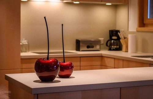 The modern kitchen is fully equipped with state-of-the-art appliances, facilitating effortless meal preparation. A wood-burning stove adds warmth to the living area, complemented by a cable TV and Bose speaker system for entertainment. Complimentary WiFi ensures seamless connectivity throughout the apartment.