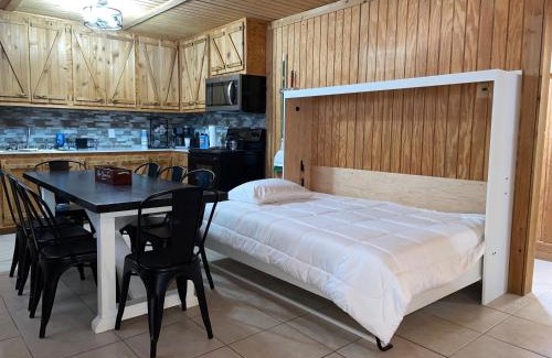 - Studio cabin #2 with lake view, boat dock access, outdoor seating, and firepit.