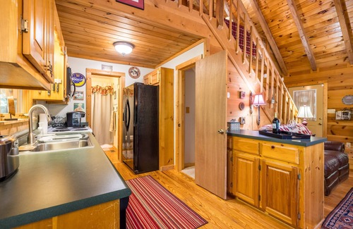 The main floor features the living room with a wood-burning fireplace, a leather couch and chairs, the dining area and the kitchen. The kitchen is equipped with full size appliances, including a refrigerator, dishwasher, stove top and oven. There is also a microwave, toaster, blender, and Keurig coffee maker. The cabinets are filled with all the dinnerware and cookware you will need to prepare meals at the cabin. There's cooking utensils and flatware, too. Located just off the living room is the master bedroom with a king size bed and an en suite bathroom with a shower/tub combination.