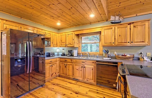Black Bear Cabin is a spacious 3-bedroom 3 bath home. Enjoy private space with a bedroom and a bath on each floor. The master bedroom is a Queen on the 3rd floor with its own private balcony and private bath. Main floor has a Queen bedroom with sliders going out to the deck and a shared bathroom. Gather the family in the dining room for meals that you've whipped up in the fully appointed kitchen. Cozy up with your favorite book in front of the gas fireplace. Grab a fresh cup of coffee and breathe in the fresh air on the wraparound deck, or soak in the hot tub after a full day of hiking or a day at the lake and let the fall foliage blow you away. Downstairs holds the 3rd Queen bedroom and a shared bath. The door from the game room will lead to out to the hot tub. So come sit back and relax and enjoy the view.