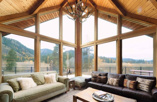 With panoramic views of both Sheep and Bald Mountains and the greater Rockies of the Lolo National Forest, the newly renovated Black Bear Chalet is designed to capture Montana's great outdoors with dramatic windows. A genuine log cabin with a striking central riverstone chimney, the Chalet offers astonishing 360 degree views and all the comforts of home. Surround yourself with the warmth of Western living.