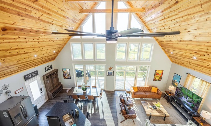 The main level showcases a 30+ ft ceiling with stunning views of Canaan Valley State Park. The open-concept living area flows seamlessly into a well-equipped kitchen and dining space. The primary bedroom, located on the main level, includes a king-sized bed and an en-suite bath. Upstairs, two more spacious bedrooms, each with a queen-sized bed, share a full bath.