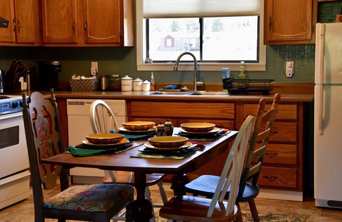 Attached two story house in a quiet rural area situated between forest and meadow which teems with birds and hawks, and is visited by deer and elk and the occasional coyote. I garden with native plants and encourage visits from a variety of birds. Which use the 40 foot spruce as their own apartment. A pair of red tail hawks hunt in the back pasture. You can catch them on camera while having coffee on the back porch.