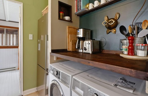 The fully stocked kitchen boasts a delightful coffee bar, while the open living and dining area, complete with a fireplace and record player, provides the ideal space to unwind after a day of adventure.