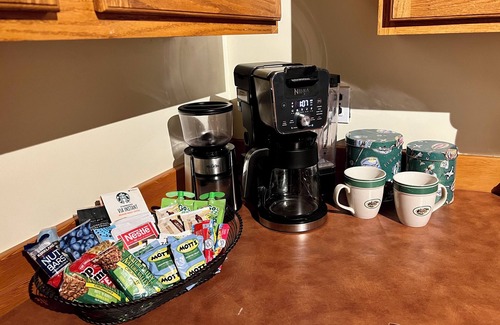 The Cabin itself sleeps 8 people and boasts plenty of room for everyone! There is a large dining room for gathering and overflow into the open living room with a cozy fireplace for those chilly nights. Kitchen is fully equipped and you’ll have access to laundry facilities. It features 3 Bedrooms and 3 Bathrooms. A king bedroom is on the main with an accessible bathroom. The “Bears Den” has a queen-size bed, two twins and a spacious attached bathroom. The “Moose Room” has two twin-sized beds and an attached bathroom. The two-level layout is perfect for groups or a multi-generational getaway.