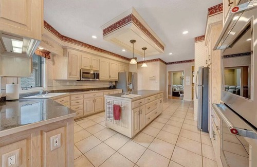 -Spacious kitchen with open breakfast nook with amazing lake views (two large refrigerators, one with water and ice maker, microwave, toaster, Keurig coffee machine, a double oven, utensils, plates, cups, mugs, pots and pans, walk in pantry).