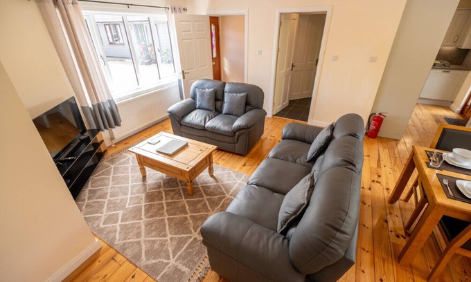 Discover an inviting open-plan layout, where the kitchen, dining, and living areas seamlessly blend together. Unwind in the living area, where two comfortable sofas surround a smart TV, ideal for cosy nights in after exploring the surrounding countryside.