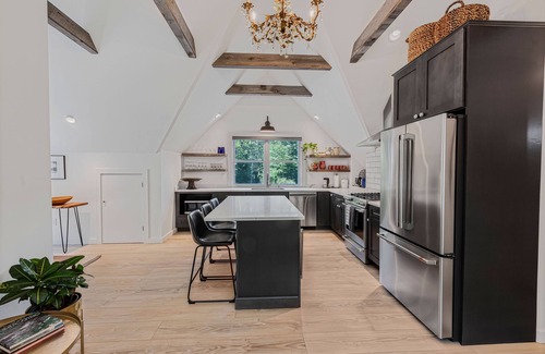 The owners wanted to create a space that was warm & comfortable with a touch of rustic, old world charm. The weathered beams , chandeliers, old doors with crystal knobs combine the old and new charm and elegance to every room. A full kitchen has everything one needs to cook a gourmet meal with pots & pans, platters, drip coffee machine & french press coffee maker, nutri bullet, wine refrigerator, GE CAFE series gas range & a large GE fridge .