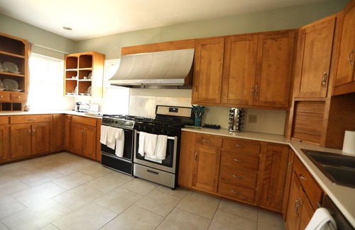 You'll enjoy walking into this private home. Hopefully the home will help you enjoy your stay with all its amenities. Walk into the expansive living room with an adjacent sun room with a foosball table and three full walls of windows that look out to a landscaped patio and surrounding mature trees. The living room features: A pull out queen size sleeper sofa, a 40" flat screen TV with Roku, shelves of games and black out curtains. The living room opens up into a dining room, where you can enjoy dinner cooked at home, or delivered from one of our many nearby restaurants. The dining room features: a dining table with seating for 8 people. The big open fully equipped kitchen features: everything you need to cook meals at home. Rounding out the first floor are stairs and a convenience half bathroom. One set of stairs lead up to the bedrooms and full bathroom. After a busy day, soak in the blue tiled bathtub enclosure and sleep in any one of the four quiet and restful bedrooms. Each bed offers: queen and twin size memory foam mattresses, eco friendly bamboo sheets, and blackout curtains. The other set of stairs down lead to the basement which has an air hockey table.