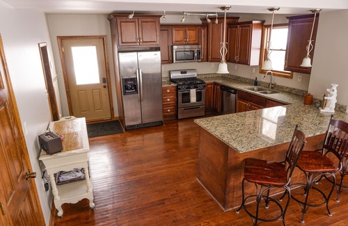 Your stay includes a fully equipped kitchen with granite countertops, an eat-in breakfast bar, and a dining table that seats up to eight guests—perfect for pre-wedding brunches or post-ceremony dinners. Unwind in the wood-paneled parlor room with comfortable seating and a smart TV for entertainment. The property features a large back deck with outdoor seating for summer gatherings, a gas grill for alfresco meals, and a fully-fenced backyard where you can relax. Each bedroom boasts plush Tuft & Needle mattresses and smart TVs to ensure a restful stay, while complimentary toiletries add a touch of luxury to your experience.