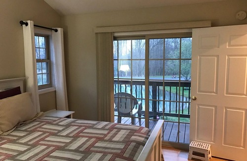 Quiet getaway in the country near downtown Bloomington. Private pond for fishing and swimming. Enjoy bonfires, trails and beautiful views. 800 sq. ft. of living space with one bedroom and large sectional and room for air-mattress. Note, there is not a futon, but a large sectional couch, perfect for a couple kids. Also floor space for a full sized air mattress.