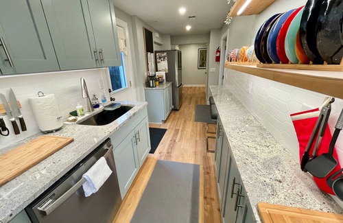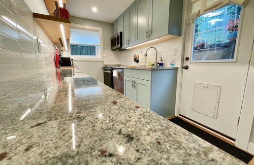 This is a beautiful and newly remodeled 2-BDRM on the ground floor of a stacked duplex (the upper level is a completely separate unit). Cozy fireplace, reclining sectional, 70" smart TV, free parking and wifi, fenced yard, fire pit, private entrance, deck and furniture. Handicap accessible through the garage.