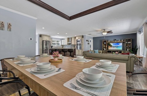 The cottage features a large, open-concept kitchen, dining, and living area designed for togetherness. The fully equipped kitchen is perfect for preparing meals for large groups, with a kitchen island that seats 4 and a dining table for 8. A wall-mounted oven makes cooking effortless, so you can enjoy good food while socializing.