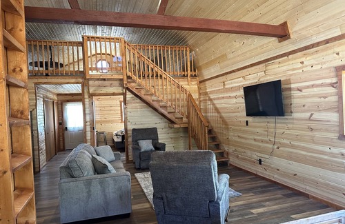 Enjoy a quiet stay in the country at our modern cabin that has room to sleep 8. We offer a bedroom with a king size bed, a loft area with a queen bed and a sofa bed. The living area also has a sofa bed. This cabin has a full kitchen, bathroom, A/C, heat, WiFi and cable tv. We are minutes away from UCM and Whiteman AF Base an hour from KC. The Rock Island trail is minutes away for your bicycling or walking enjoyment. Our amish bulk food store is located on the same property for a unique shopping experience. EV chargers are also available. We do have security cameras in the driveway and parking lot that is monitoring 24 hours a day.