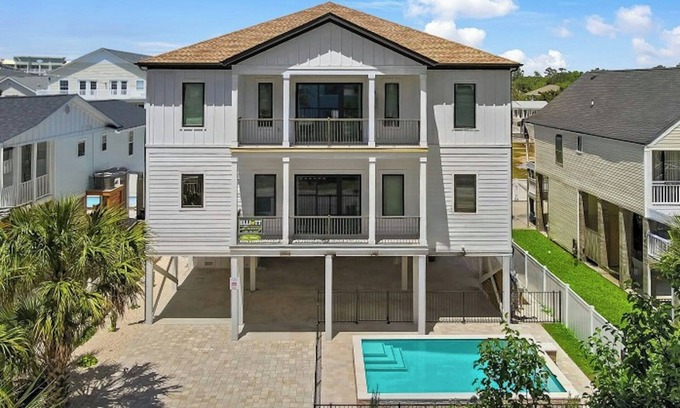Blue Dolphin is the ultimate luxury beach retreat, perfect for family vacations, reunions, or golf getaways. This brand-new 6-bedroom, 5-bathroom home is located just 3rd row in the Windy Hill neighborhood of North Myrtle Beach. The spacious layout offers plenty of room to relax, with two living areas, two kitchens, and an elevator for easy access.For large groups, consider renting our sister property, The Blue Whale. The Blue Dolphin and Blue Whale have an adjoining doors making it perfect for large groups. Please see link below if interested. https://www.vrbo.com/20084644haThe main level features 2 bedrooms, 2 bathrooms, and an open-concept living space with a gourmet kitchen, dining area, and cozy living room, ideal for family meals and events. Upstairs, you'll find 4 more bedrooms, including 2 with a Jack-and-Jill bathroom, plus a second family room and kitchen. Luxurious touches like high ceilings, granite countertops, and top-tier appliances enhance the entire home. For fun, enjoy a game room with a ping pong table or a refreshing dip in the shared pool. Just steps from the beach, Blue Dolphin is perfectly situated to explore North Myrtle Beach’s attractions, from amusements to local cuisine. Book today for an unforgettable getaway!Please Note: We rent to families only.House parties, loud noises and extra vehicles are prohibited violation of this will result in eviction.