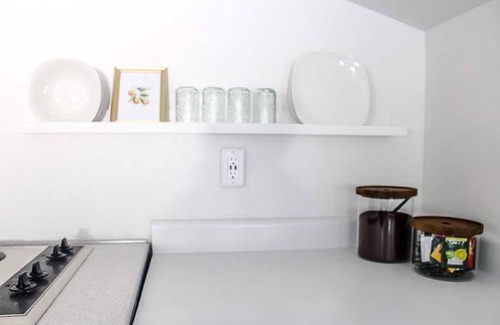 This space is fitted with 1 queen-sized bed and 1 futon as well as a washer and dryer located in the entryway of the apartment. It also has a kitchen which includes a stove, oven, full-size fridge, dishware, pots and pans. The bathroom has a full bath/shower. This space is air-conditioned and heated, both of which the guest have full control of.