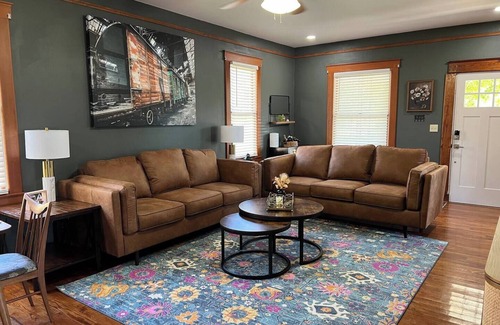 From the cute pink door, all the way through to the backyard, this house is anything but boring. You will love the warm brown leather sofas, the antique interior glass french doors, the eclectic art, and the bonus arcade room. Play all your favorites! Pac-man (on an old 80s pizza hut arcade table), Burgertime, Simpsons, EVEN Fix it Felix JR!! TVs are in all the rooms, so you can retreat to a space all your own. Hang out on the patio and enjoy a fully functional kitchen space. Don't forget to greet all the bathroom portraits while you are in there! Full laundry facilities are also on site, so you will be set for any length of stay!!