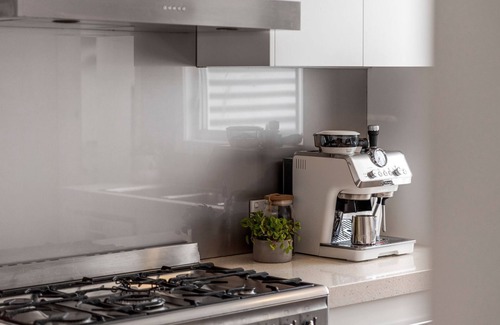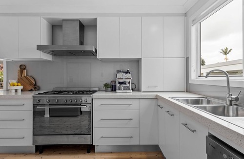 The fully equipped kitchen and dining has been beautifully renovated with large windows and doors opening out to the entertaining deck creating a servery/bar area for guests to sit. There is a dishwasher, oven, stovetop, microwave, full size fridge/freezer, and cafe style coffee machine with grinder.