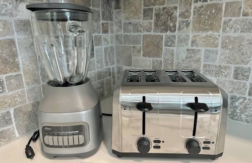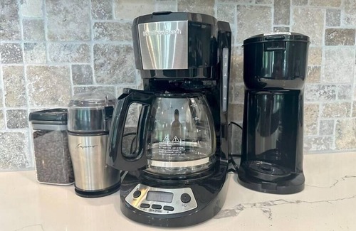 Both Drip and Keurig Coffee Makers, 4-slice toaster, stove top kettle, blender, 6-Quart Slow Cooker, and hand mixer
