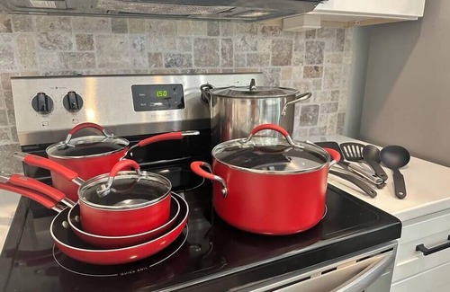 Fully stocked kitchen with all stainless steel appliances (Full size fridge, stove, dishwasher, and microwave)