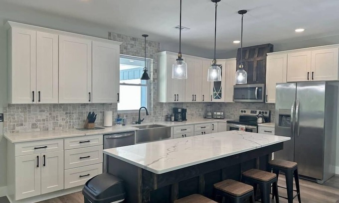 Absolutely beautiful 2,404 sq ft home with 8 beds across 3 bedroom and 3 bathrooms and a half bath. Main floor has everything you need including the living room, kitchen, dining, primary King bedroom with ensuite and laundry room. Head upstairs for the additional two bedrooms. First bedroom upstairs has another King, twin, and trundle twin. Second upstairs bedroom as two twins with two trundles.