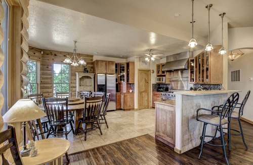 When you walk inside Blue Lake Lodge, the beauty of the home’s interior will amaze you. Vaulted and beamed ceilings are complemented by a stone fireplace and log walls. You’ll want to toss your bags down and settle into the comfortable couch and loveseat. The Southwestern décor is so cozy and through your large windows and glass doors, you have a view of the deck and forest beyond. Blue Lake Lodge has a flat-screen TV with cable and a DVD player in the living room. Gather your group to watch a favorite movie. There’s also free Wi-Fi within the home that makes it so convenient to send photos to friends.