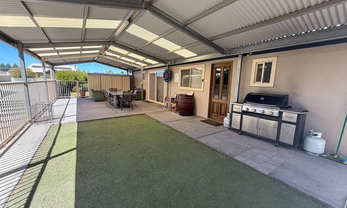 Private undercover courtyard with Webber Q BBQ, outdoor setting, ceiling fan, lounge, TV & Stereo.