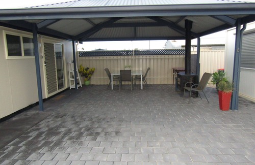 Paved undercover area with gas BBQ, access to 2nd w/c, outdoor setting and combustion heater (BYO WOOD), this is between the unit and cabin/bedroom.