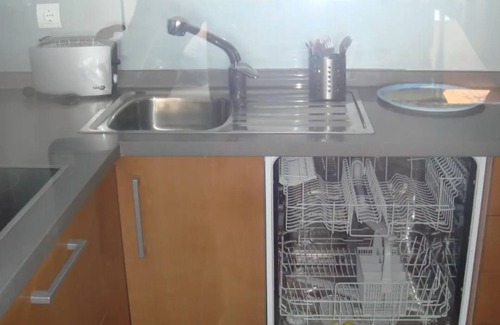 Fully furnished kitchen with hob, dishwasher from which you can see the sea also equipped with thermos, microwave and washer-dryer.