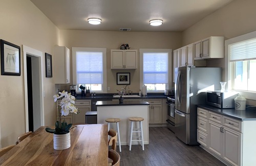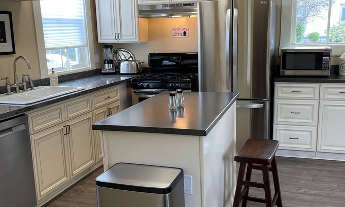 Fully stocked kitchen with large dining table. New appliances and granite counter. Nice sitting room with electric fireplace leads to large separate living room with 55” smart tv and plenty of seating. High speed WiFi. 4 bedrooms upstairs 3 with queen beds and one bedroom that leads to upstairs bath with queen futon. Upstairs bath is all new with large walk in shower unit. Addition futon sleeps two more in one of the upstairs bedrooms if needed. Downstairs bedroom has writing desk. Downstairs bathroom has tub shower unit. Separate laundry room with courtesy laundry supplies included. Front and side yard is fully picket fenced with nice lawn. Cozy seating outside under the Gazebo with a gas fire pit and Bbq!