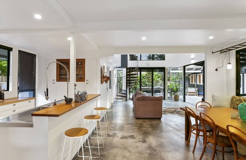 In its highly desirable riverside location this alluring river house provides a perfect blend of old school Noosa charm with modern design features. Alfresco living with wide timber decks, tropical gardens, a large pool and a built in trampoline.