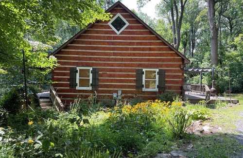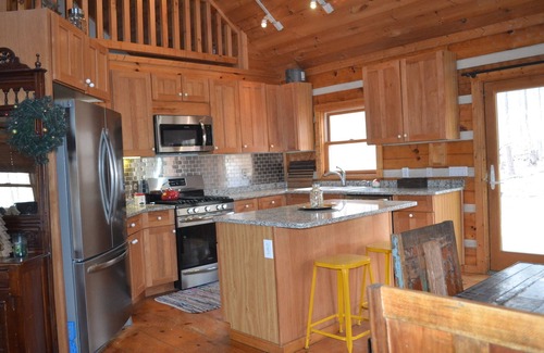 Rustic, authentic, Appalachian style log cabin with vaulted ceilings, loft, pot belly wood stove, and three quaint bedrooms: Master (queen) bedroom has own bathroom with large claw foot tub and separate shower. Second bedroom (king) is a huge inviting loft with bright skylights and sliding barn door for privacy. Third bedroom (full) is simple, but cozy. Kitchen has everything you need for your stay including pots, pans, utensils, blender,toaster, coffee pot and more. Back deck overlooks open acre of gently sloping land.