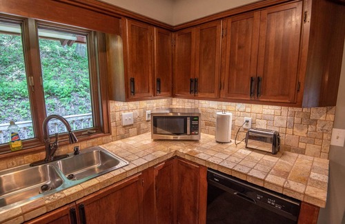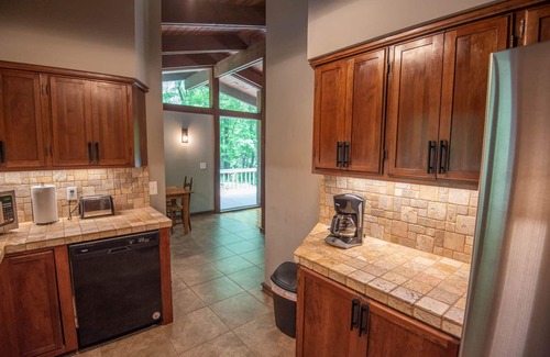 Black Dog offers one-floor living, so you don't have to worry about lugging suitcases upstairs! The master bedroom has a queen-sized bed, and the adjoining bath has double vanities and a tub/shower combination. The additional two bedrooms have comfy double beds and a shared bathroom. The cabin is also outfitted with a laundry room and utility sink, perfect for longer stays.