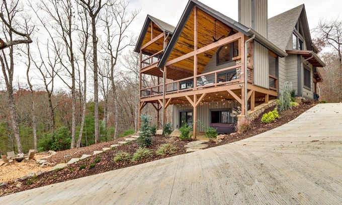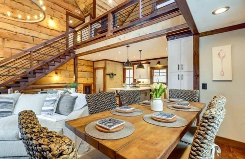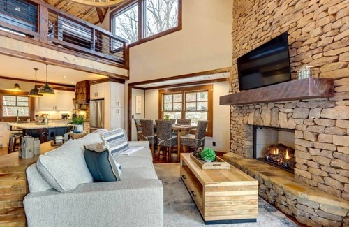 The ultimate indoor/outdoor mountain experience! Our new 3-story home offers breathtaking views from multiple covered decks, a fireplace & TV, a private hot tub, & a wood-burning fire pit. Inside, find comfort with 2 living areas, 3 king bedroom suites, & a fun loft with bunk beds. Perfect for large groups, you'll have everything you need, from a fully stocked kitchen & wet bar to an air hockey table for endless fun. Create lasting memories here!