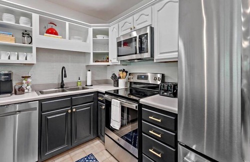 Main level: Living room with gas logs fireplace & 50" smart TV with streaming only; Kitchen with bar seating for 4, stainless appliances, smooth surface stove, toaster, dishwasher, and 3 types of coffee makers (Keurig, Standard Drip, and French Press); Dining area with seating for up to 8; Bedroom with queen bed and connected workstation; Hall bathroom with washer and dryer & ADA certified toilet and counter.