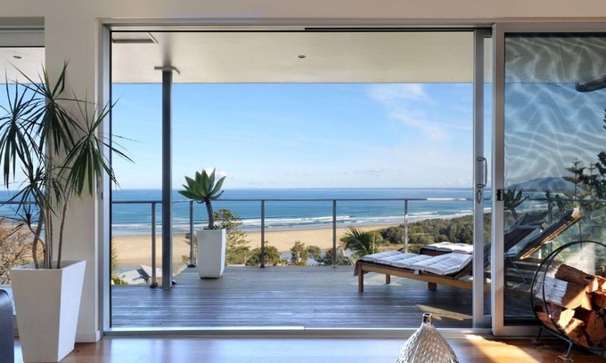 Blue Salt Gerroa is a luxurious hillside house with spectacular, panoramic, uninterrupted views of the Pacific Ocean, the Seven Mile Beach and the Crooked River. The house is elevated, being located at one of the highest points in Gerroa, allowing for expansive and extensive sweeping water views in all directions. These views can be seen for miles and miles from two large decks and internally through a very wide 16 metres of glass panels and doors, which open to the decks.