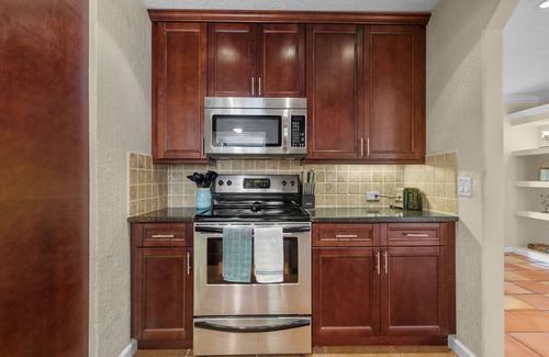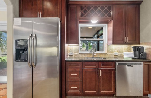 Welcome to our 2-bedroom, 2-bathroom home with an amazing HEATED pool. Enjoy a comfortable stay in our cozy-furnished bedrooms and relax in the living room with the world's comfiest couch and flat-screen TV. Our backyard oasis features a sparkling pool and outdoor area surrounded by palm trees, perfect for relaxing and spending time with loved ones. The fully equipped kitchen has all the modern appliances you need. Swim all year and make your vacation unforgettable at our amazing home.