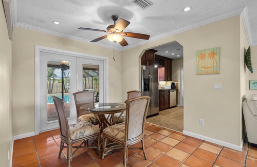 Yet, the pièce de résistance lies outdoors. Step into your personal haven—a glistening electric heated pool beckons, encouraging a refreshing dip or leisurely sun-soaked repose on inviting lounge chairs. Whether engrossed in a good book, sharing delightful moments with loved ones, or simply reveling in the serene backdrop of Florida's palm-fringed landscape, this outdoor oasis is bound to captivate.
