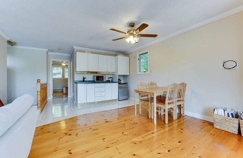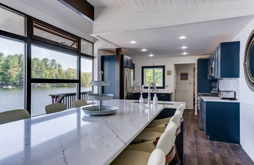 Beautiful newly renovated cottage with a stunning designer kitchen featuring high-end appliances, a gas range, marble countertops, an island that doubles as a dining table with seating for 8. Walkout to the deck for BBQing and outdoor dining.
