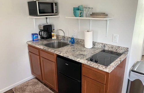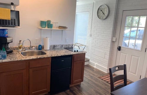 Enjoy staying at a mid-1900 gas station that has been converted into a studio cottage. Located minutes from Bethany's town square, this recently renovated space is great for singles as well as couples who wish to explore Northwest Missouri or individuals traveling for business and want a home feel vs. an impersonal hotel room. Blue Sky Cottage offers a studio style lodging with a Queen bed, sofa bed, a small dining area, kitchenette and a bathroom with a walk-in shower. Wireless Internet provided.