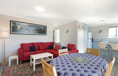 The main bedroom is spacious and home to a queen sized bed, large built in wardrobes and a small floor heater for those chilly nights. The second bedroom is home to a single bed and a double bed (sleeping 3). The living area is opened planned and flows from the kitchen and dining, there is air-conditioning in the main living area to enjoy no matter what time of the year.