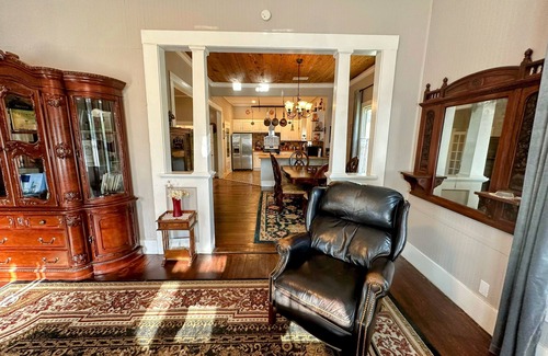 The stay features two oversized bedrooms with comfy queen beds, a welcoming living room with antique furniture, a king-sized dining room, a large and fully equipped kitchen, and a spacious laundry room.