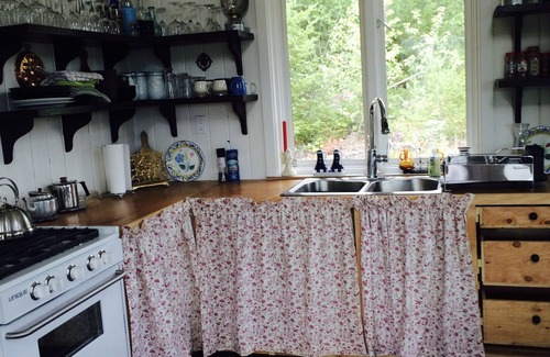 The large comfortable living room with vaulted ceiling and enchanting decor is set next to the kitchen. The master bedroom features a cast iron clawfoot bath, alongside a large sofa and has a very comfortable king size bed. The 400 square foot loft has a queen size bed with space for two twin beds. The bathroom has a pedestal sink, ceramic tiled shower & toilet.
