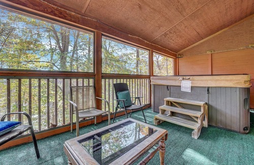 There is a covered open deck overlooking the woods below with seating for watching the wildlife and relaxing. The hot tub for this cabin is just steps away outside the great room on an elevated, screened porch at treetop level, overlooking the woods!
