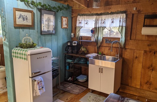 A beautiful hide-a-way in the trees. Water is provided for showers (hot), dishes etc. Check out evanscliff dot com for our properties.
