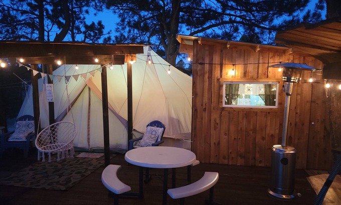 Small cabin with bathroom and kitchen and a Sibley Double Bell tent.