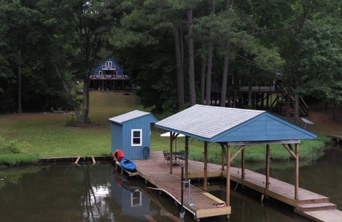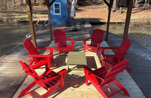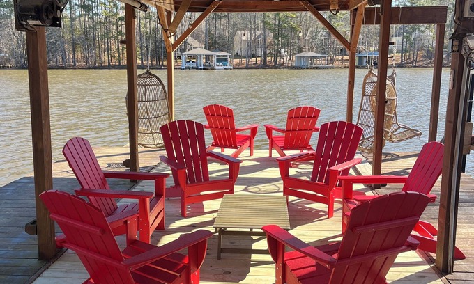 WATERFRONT 3-story house with 3BR + bonus bunk room, 3.5 Bath, huge dining room open to kitchen, family room with TV & games. Double walkout porches, outdoor fireplace, grill, swing, seating, and private upper balcony overlooking the lake! Dog friendly! (Just email us to line up deposit & fee.)