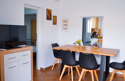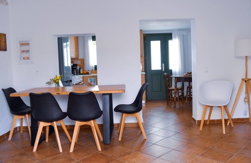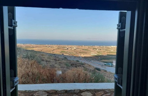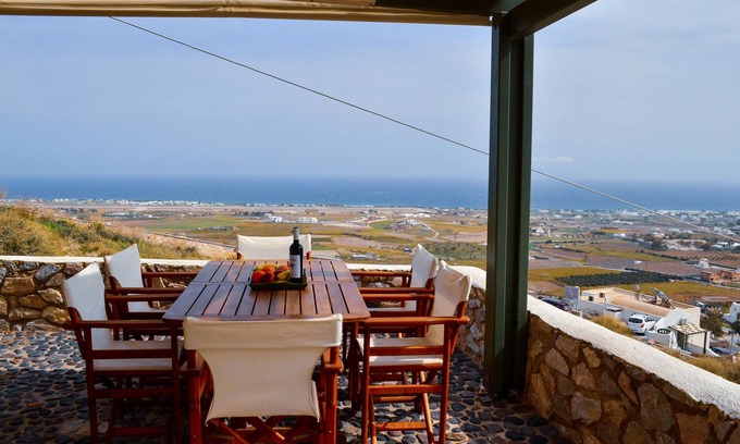 The house is traditionally bulit and newly renovated, It is on a cliff and overlooking the Aegean Sea, the mountain and the villages of Pyrgos above and Kamari below. It has 3 bedrooms, a fully equipped kitchen, one bathroom with all amenities, spacious dining and ligving room with large dining table and a comfy couch. Around the house there is a huge veranda with a unique view, you can relax on the dining table outside. The house is also served by a private parking lot outside the house.