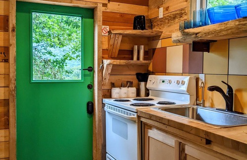 We have a fully equipped kitchen with everything you'll need including pots & pans, dishes, cutlery, coffee, tea, spices, an electric range & oven, microwave, French press & drip coffee maker. Our living room, with a unique round window that's perfect for bird watching, has a couch that transforms to accommodate a twin sleeping space. Upstairs has a bedroom with a queen size bed, windows overlooking Suck Creek with a view of Signal Mountain, reading chairs, and a smart TV. Also upstairs is the bathroom with a giant walk-in shower with shampoo, conditioner, and body wash there for you. We have a small washer & dryer for your use as well.